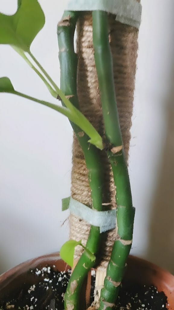 Like moss poles, the coco coir must still be tied to the support pole. And, like moss, it has water-retention properties that help sustain your plants’ aerial roots. Although, in our experience, it doesn’t stay as moist as sphagnum moss.